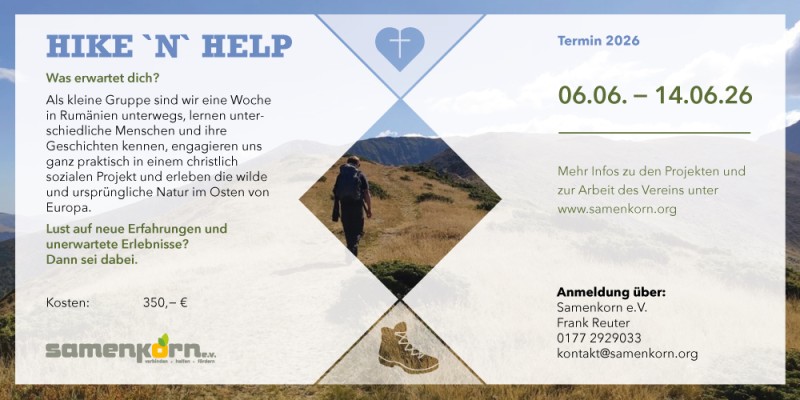 Eine Woche Hike n Help ist eine besondere Möglichkeit, das Land Rumänien, die Menschen dort und ein Projekt von uns näher kennen zu lernen. Wenn ihr dabei sein wollt oder mehr Infos braucht, dann schreibt uns einfach eine Mail oder eine Nachricht oder ruft uns an.